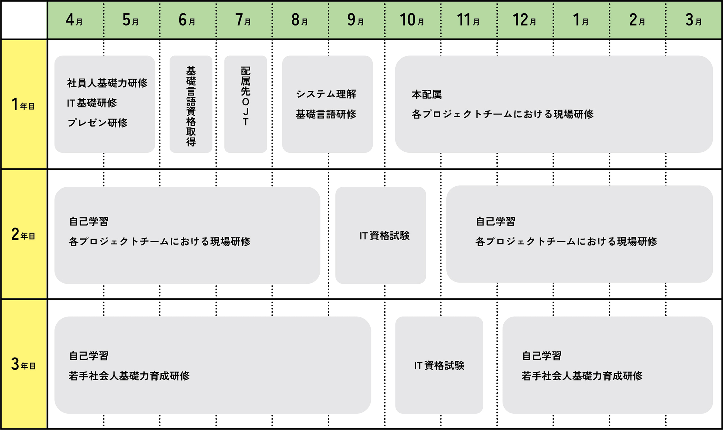 6ヶ月間のプログラムで構成されており、最初の3ヶ月間で社外研修を含む基礎的なITスキルと社会人基礎力を学びます。その後の3ヶ月は実務経験を積むためのOJT(実地研修)が行われます。この研修は、新入社員が自立して業務を遂行できるように、技術スキルとプロジェクト管理技能を育成することを目指しています。