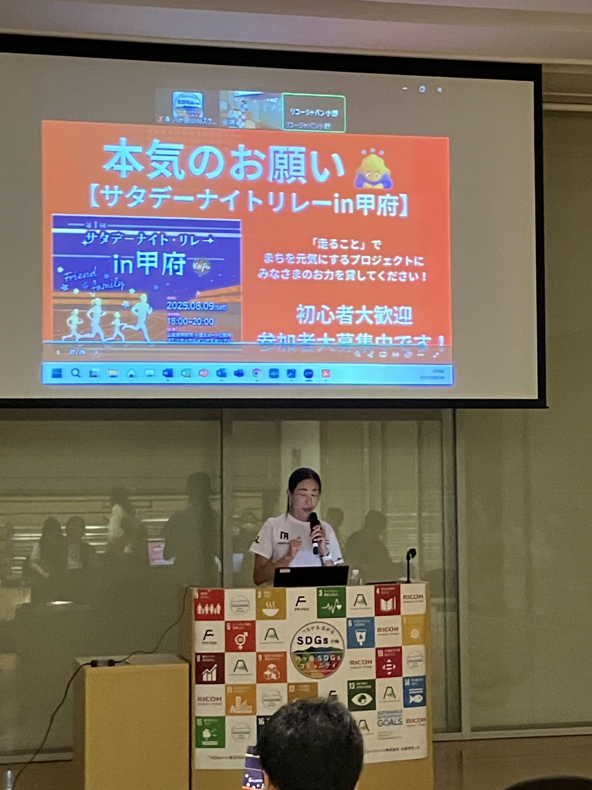 続いて登壇された三枝氏からは、ランニングを通じた共生社会の実現に向けた取り組みが紹介されました。甲府市で「速さを競う」だけでなく、「誰もが主役になれる」ことを目的とした、誰もが参加しやすい“走る場”づくり。年齢、性別に関係なく、すべての人が「走る」ことで自分の力を実感できる環境づくりへの想いが語られました。