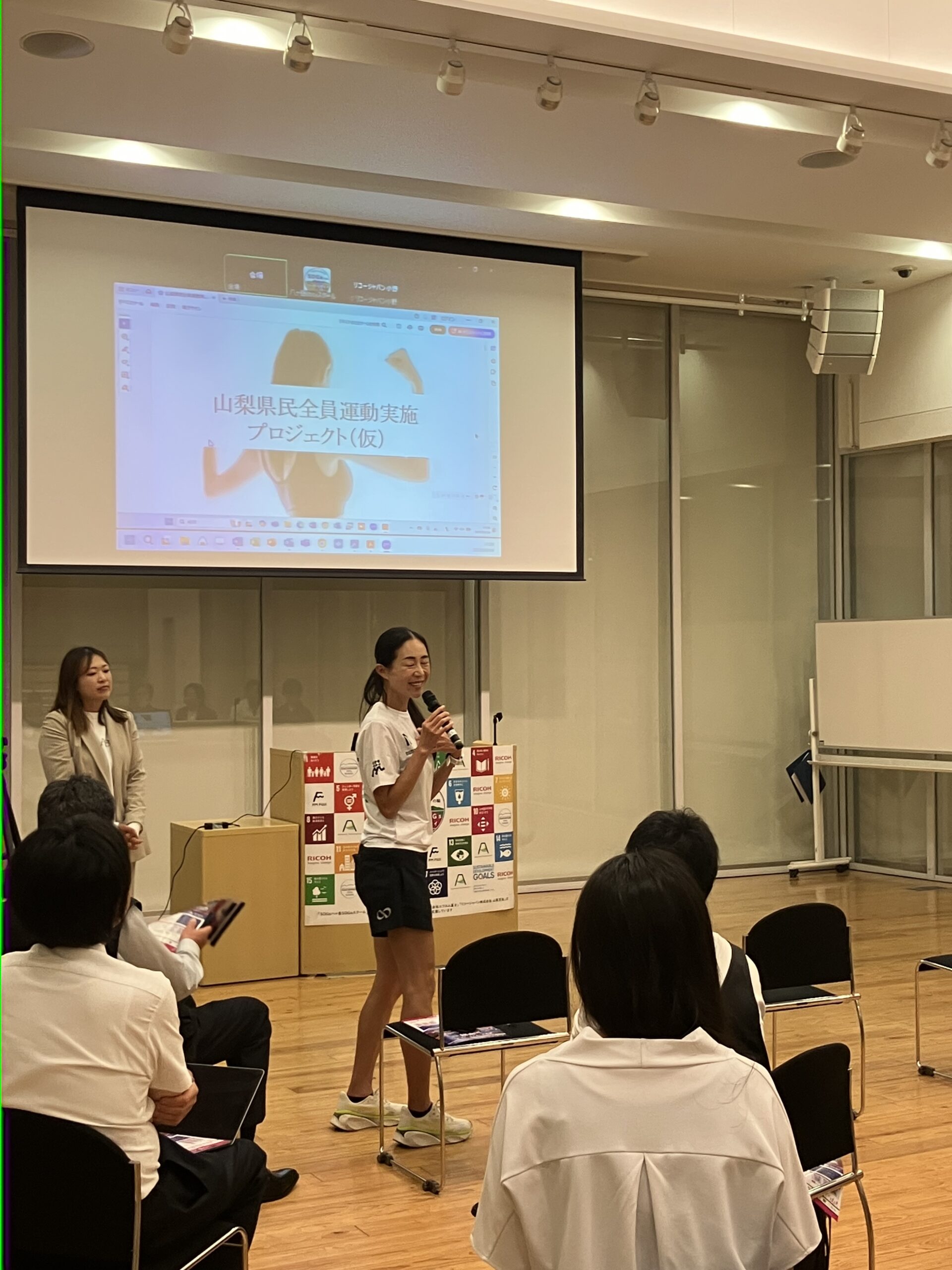 最初の登壇では、地域の健康をテーマに、橘田氏が「山梨県民全員運動実施プロジェクト」について発表されました。