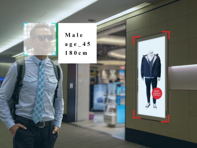 カメラによるリアルタイムの属性分析結果に基づき、性別や年齢層に応じた的確な広告を動的に配信。購入パターンや行動の変化を調査することで、広告の効果を測定し効果の高い広告戦略を立てることができます。