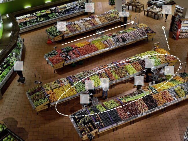 ユーザーの Wi-Fi 認証情報やカメラ画像から、リピーター顧客の識別、購買行動やコンバージョン率の把握することで、店舗の混雑状況、来店時間、人気の売場、顧客属性(年齢・性別など)の分析を行います。