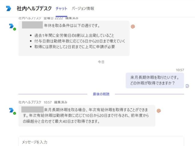 【質問を打ち込むと社内文書や最新の情報を取り入れることができる】
